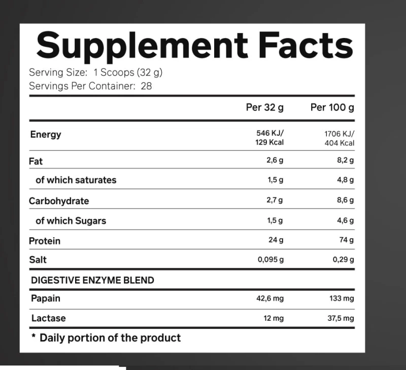 البروتين النقي: بتركيز 24 جم في الحصة، يساعد في تعزيز نمو العضلات والتعافي السريع بعد التمرين.