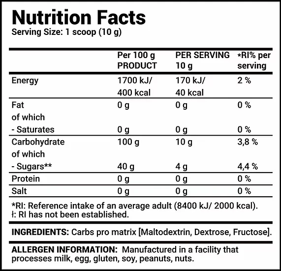 تم تناول هذا المزيج القوي من المالتوديكسترين والدكستروز والفركتوز قبل التدريب أو أثناءه أو بعده، وسيوفر الوقود لعضلاتك بسرعة عندما تكون في أمس الحاجة إليه. الكربوهيدرات هي مصدر الطاقة الأساسي لجسمك وهي ضرورية للتركيز والقوة والقوة.