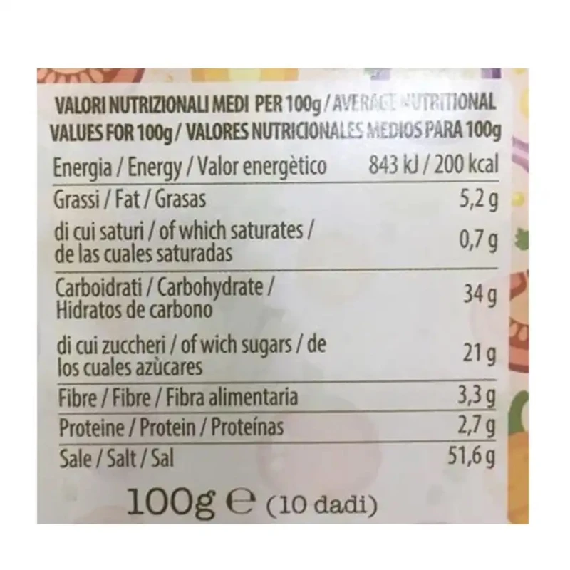 ملح، سكر خام*، خضار مجففة بنسب متفاوتة* 13,3% (بصل*، كرفس*، جزر*، طماطم*، سبانخ*، بقدونس*)، نشا الذرة*، زيت دوار الشمس*، خلاصة الخميرة، كركم* 1 %.