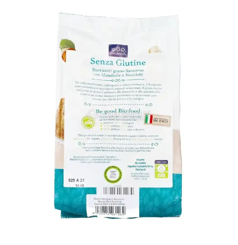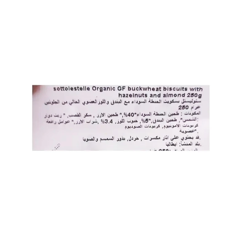 بسكويت عضوي خالي من الغلوتين بالحنطة السوداء واللوز 250 جرام من سوتوليستيل. مصنوع فقط من مكونات نباتية مختارة ومحلى بالشراب الطبيعي. تمتزج نكهة الحنطة السوداء مع اللوز والبندق، مما يمنحها رائحة عطرة مكثفة لا يمكن لأحد أن يقاومها. نباتي.