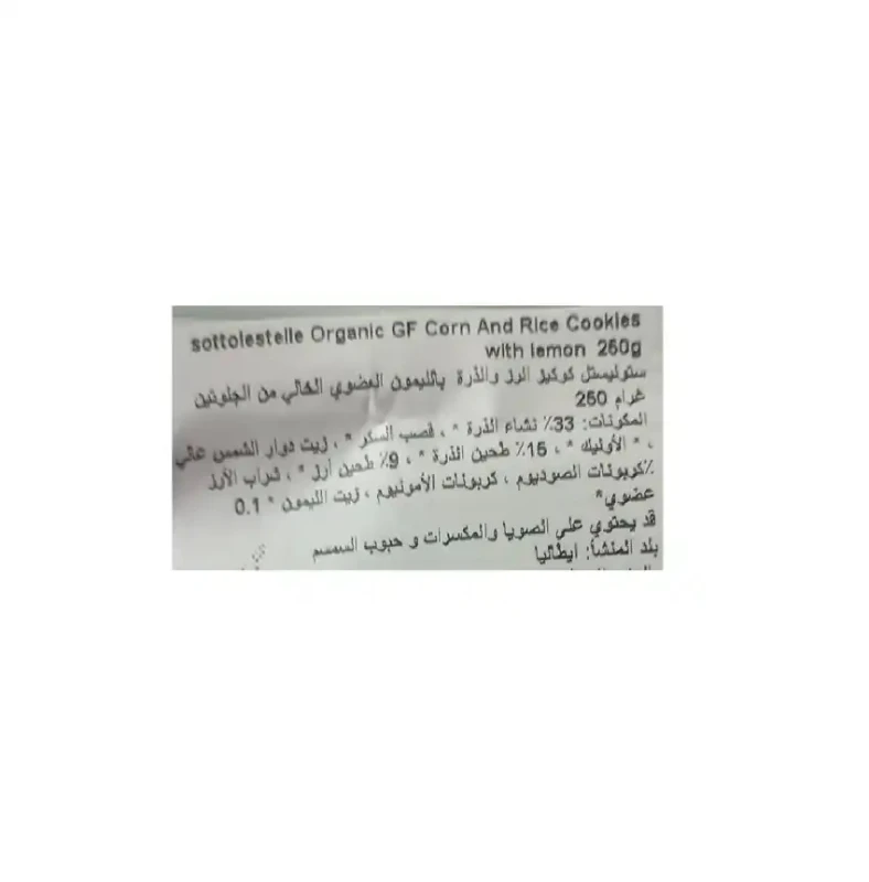 33% نشا الذرة*، سكر القصب*، زيت دوار الشمس عالي الأوليك*، 15% دقيق الذرة*، 9% دقيق الأرز*، شراب الأرز*، كربونات الصوديوم، كربونات الأمونيوم، زيت الليمون العطري * 0.1%