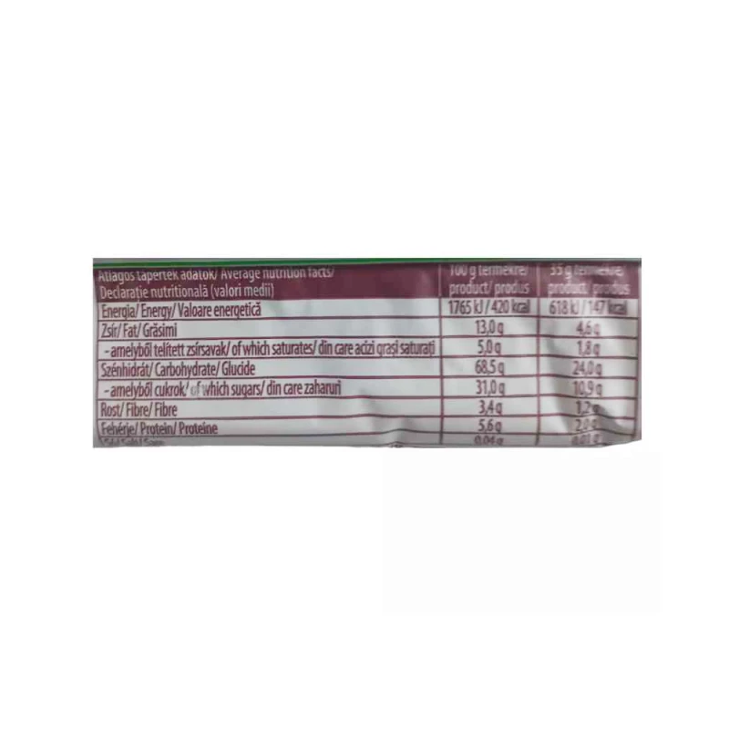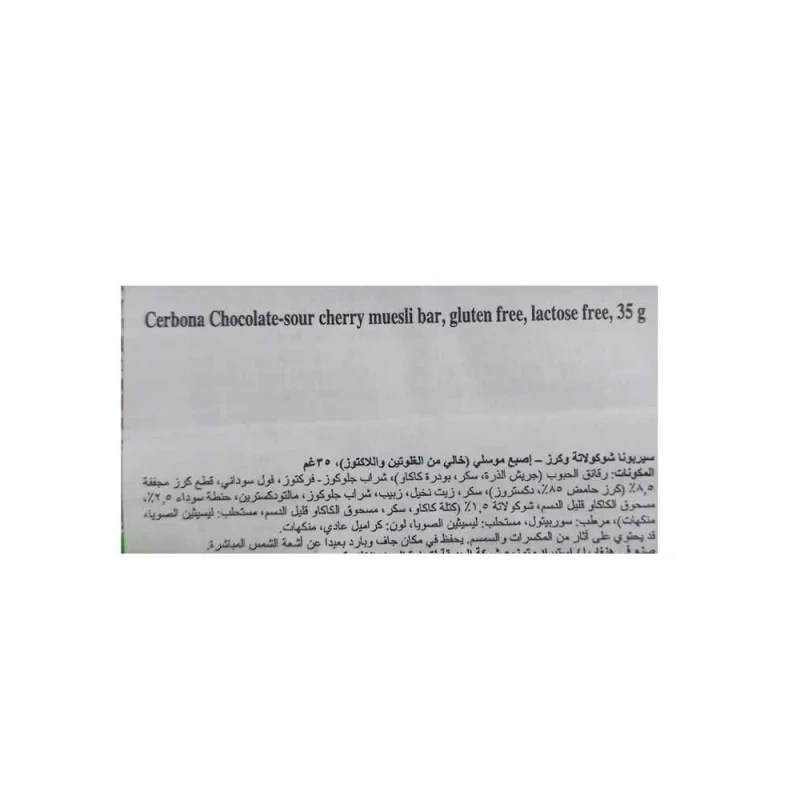 رقائق الحبوب المبثوقة (حبيبات الذرة والسكر ومسحوق الكاكاو) وشراب الجلوكوز والفركتوز والفول السوداني والسكر وقطع الكرز الحامض المجفف 8.5٪ (الكرز الحامض 85٪ وسكر العنب) والزبيب ودهن النخيل وشراب الجلوكوز والمالتوديكسترين ، مسحوق كاكاو قليل الدسم ، شوكولاتة 1،5٪ (كتلة كاكاو ، سكر ، مسحوق كاكاو قليل الدسم ، مستحلب: ليسيثين الصويا ؛ منكه) ، مرطب: سوربيتول ؛ اللون: كراميل عادي ؛ مستحلب: ليسيثين الصويا. المنكهات. قد يحتوي المنتج على المكسرات وبذور السمسم وبروتين الحليب.