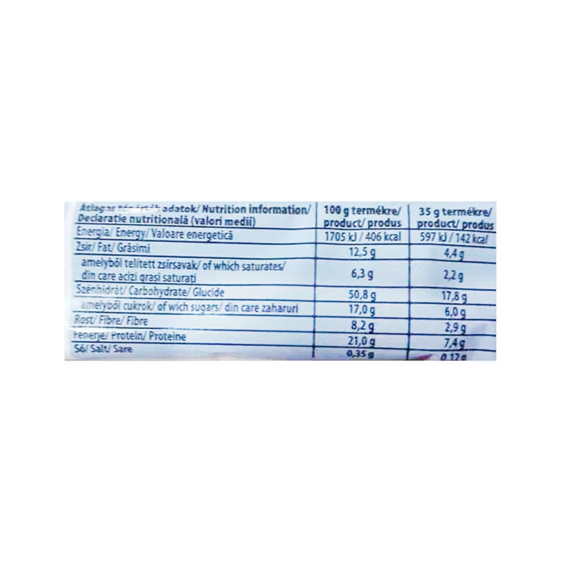 المكونات: رقائق شوفان ملفوفة 27%، اكسترودات (بروتين الصويا المعزول، نشا التابيوكا، بروتين البازلاء المعزول، مركز بروتين القمح، ملح، مثبت: كربونات الكالسيوم)، شراب الجلوكوز والفركتوز، قطع الشوكولاتة 7% (سكر، كتلة الكاكاو، قليل الدسم). مسحوق الكاكاو، زبدة الكاكاو، مستحلب: ليسيثين الصويا)، مرطب: السوربيتول، مالتوديكسترين، دهن النخيل، حبيبات الكاكاو، دكسترين القمح، قطع الكراميل 2٪ [سكر، شراب الجلوكوز، حليب مكثف محلى، زبدة (من الحليب)، ملح]، أوليجوفركتوز ، عسل، منكهات، شراب الجلوكوز، مستحلب: ليسيثين الصويا.