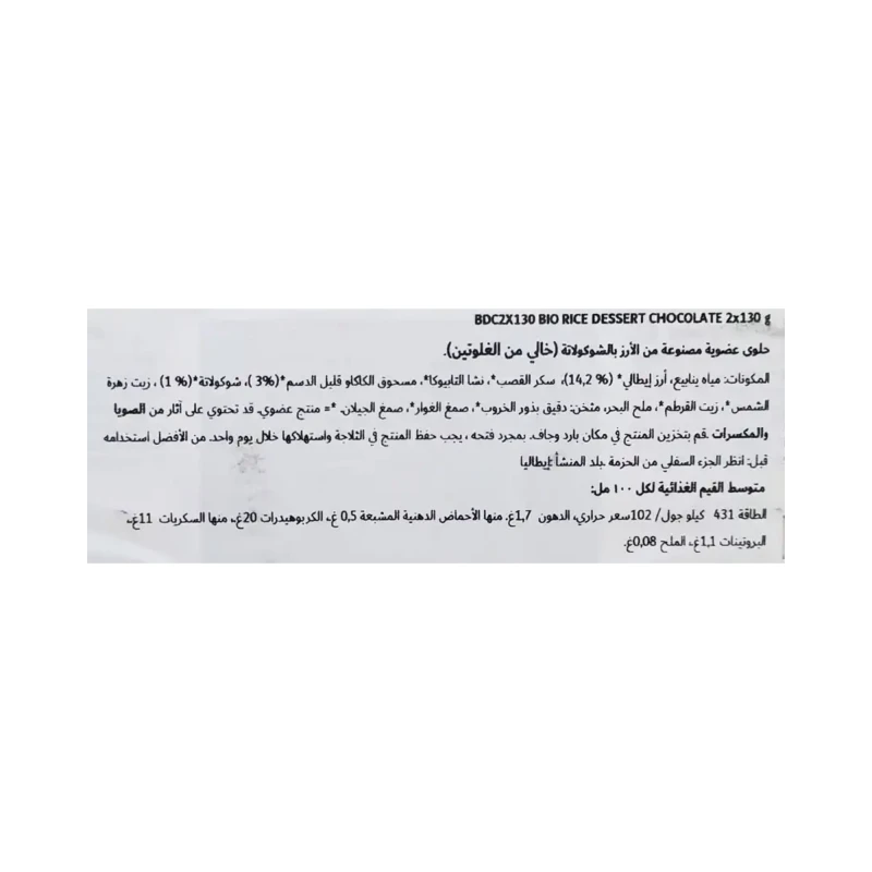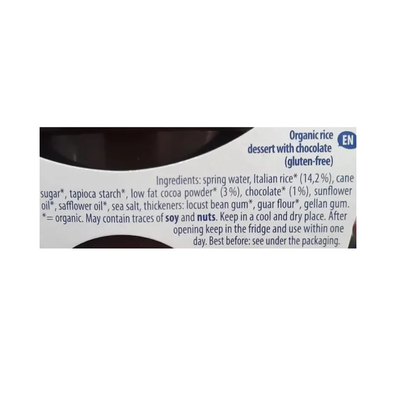 مياه ينابيع، أرز إيطالي (14.2%)، سكر القصب، نشا التابيوكا، مسحوق الكاكاو قليل الدسم (3%)، شوكولاتة (1%)، زيت زهرة الشمس، زيت القرطم، ملح البحر، مثخن: دقيق بذور الخروب، صمغ الغوار، صمغ الجيلان.