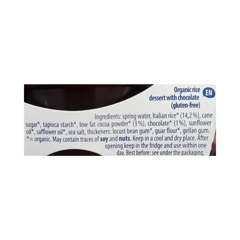 مياه ينابيع، أرز إيطالي (14.2%)، سكر قصب، نشا التابيوكا، مسحوق كاكاو قليل الدسم (3%)، شوكولاتة (1%)، زيت دوار الشمس، زيت القرطم، ملح بحري، مغلظات قوام: دقيق بذور الخروب، صمغ الغوار، صمغ الجيلان.