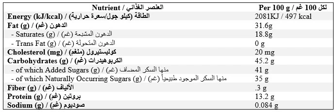 الحد الأدنى لجوامد الكاكاو في الشوكولاتة ٣١٪- الحد الأدنى لجوامد الحليب ٢٣٪