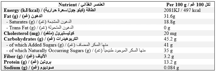 المكونات:سكر، زبدة كاكاو 25% ، عجينة كاكاو 25% ، حليب بقري مجفف كامل الدسم، لوز، ليسيثين الصويا، فائلينالحساسية :يحتوي على الصويا والحليب واللوز. قد يحتوي على البندق وجوز البيكان والفستق الحلبي والفول السوداني والمكسرات الأخرى