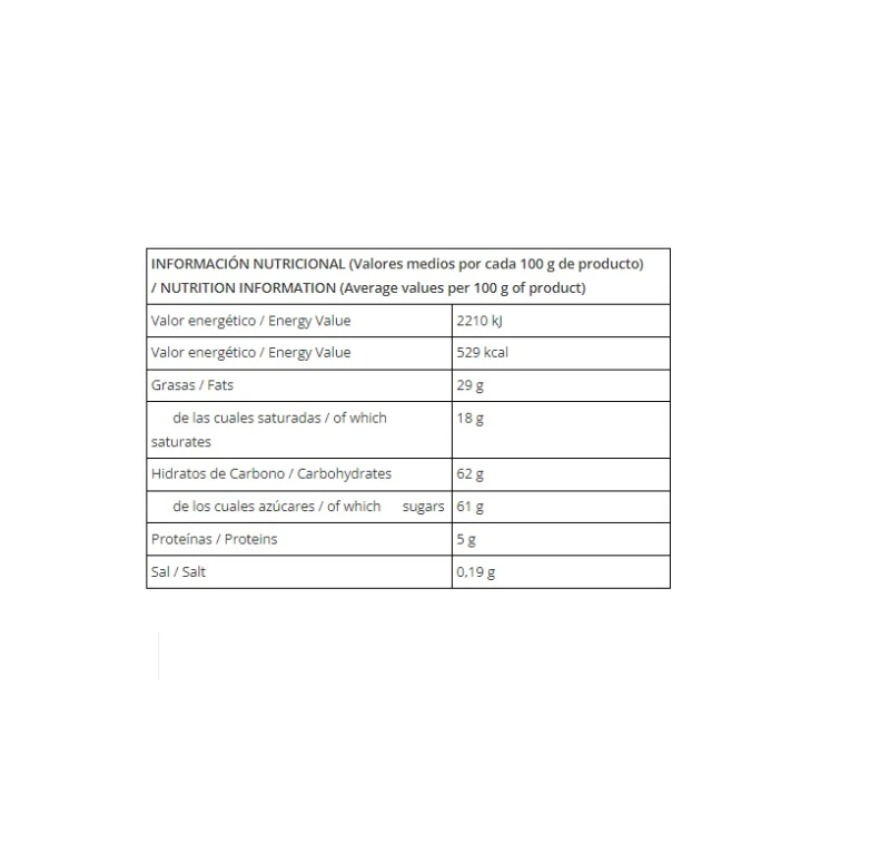 السكر، زبدة الكاكاو، مسحوق الحليب كامل الدسم، معجون الكاكاو، مسحوق مصل اللبن، مستحلب (ليسيثين الصويا) ونكهات. الكاكاو: 29% كحد أدنى. خالي من الغلوتين
