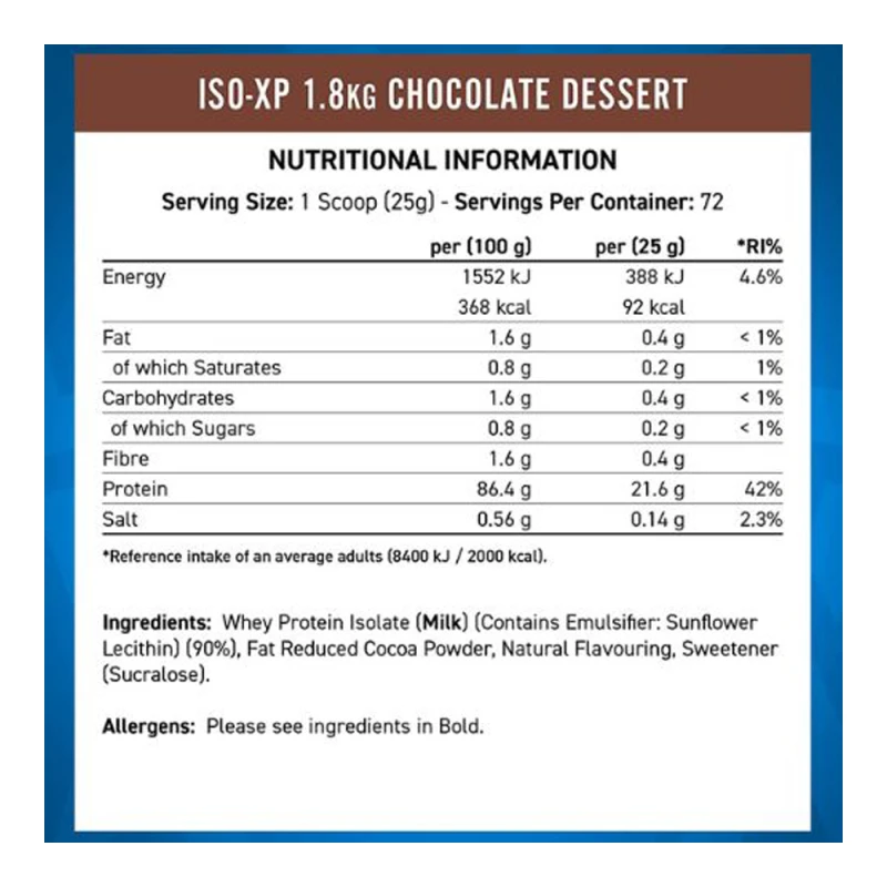 ISO-XP هو مكمل عالي البروتين مع مُحلي باستخدام أنظف وأعلى جودة من بروتين مصل اللبن المعزول المتوفر اليوم، مع محتوى منخفض من الدهون والكربوهيدرات والسكر، مع تقديم مستويات عالية من البروتين لكل 25 جرام. لا يحتوي ISO-XP على فول الصويا المضاف وبدلاً من ذلك يستخدم ليسيثين عباد الشمس كمستحلب.